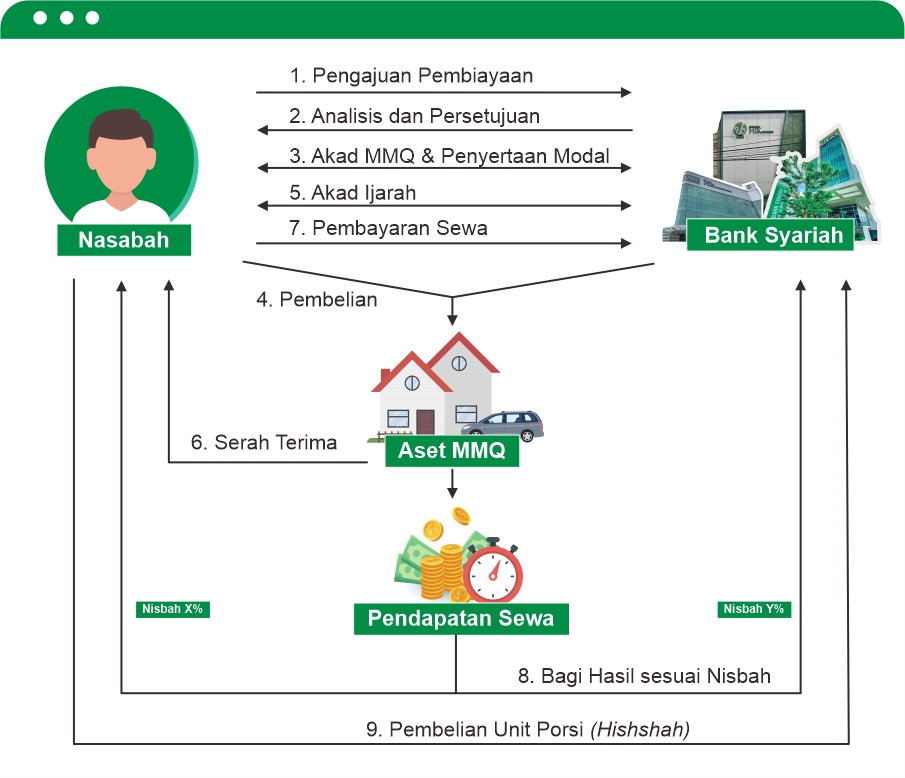Dengan skema ini, nasabah tidak membayar bunga, melainkan sewa dan pembelian porsi aset secara bertahap.